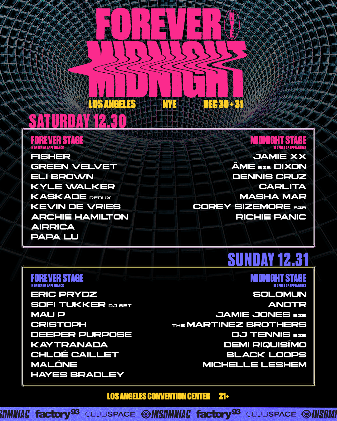 Forever Midnight is a two-day, two-city New Year’s Weekend house & techno festival in Los Angeles and Las Vegas, which Insomniac launched in 2023.