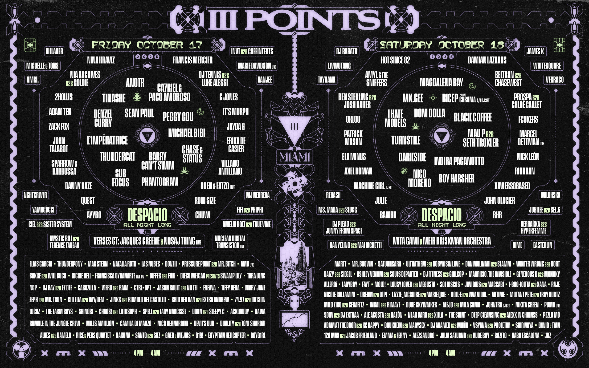 Boasting a unique and robust lineup of over 150 artists, traversing dozens of genres from leftfield electronic, to baile funk, to shoegaze, and beyond across 11 meticulously curated stages, III Points is an ambitious undertaking to say the least. The 2025 edition of the festival was led by Dom Dolla, Turnstile, Peggy Gou, Michael Bibi, and more with an impressive, tastemaker-driven undercard, and talented Miami-based artists comprising over 60% of the rest of the lineup.